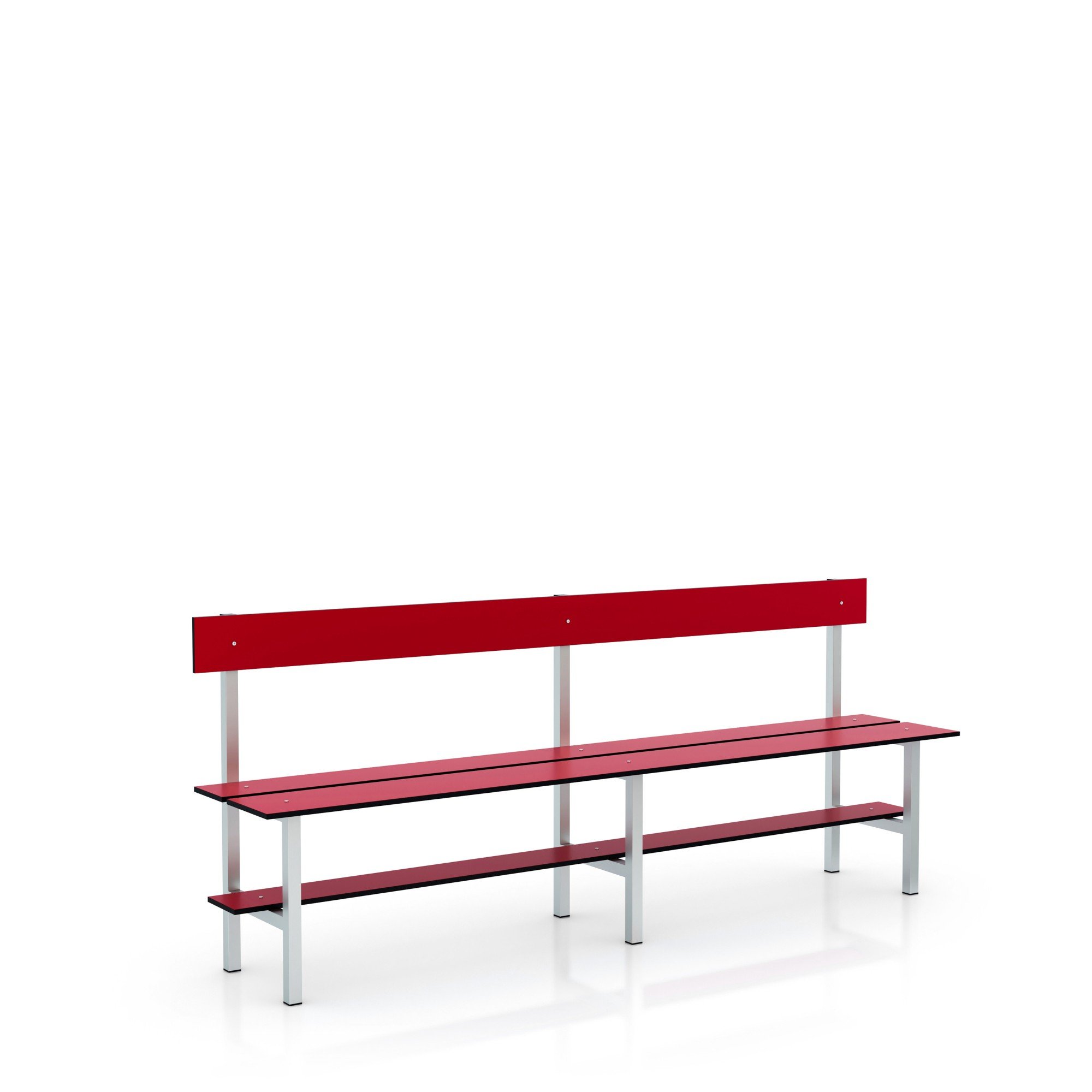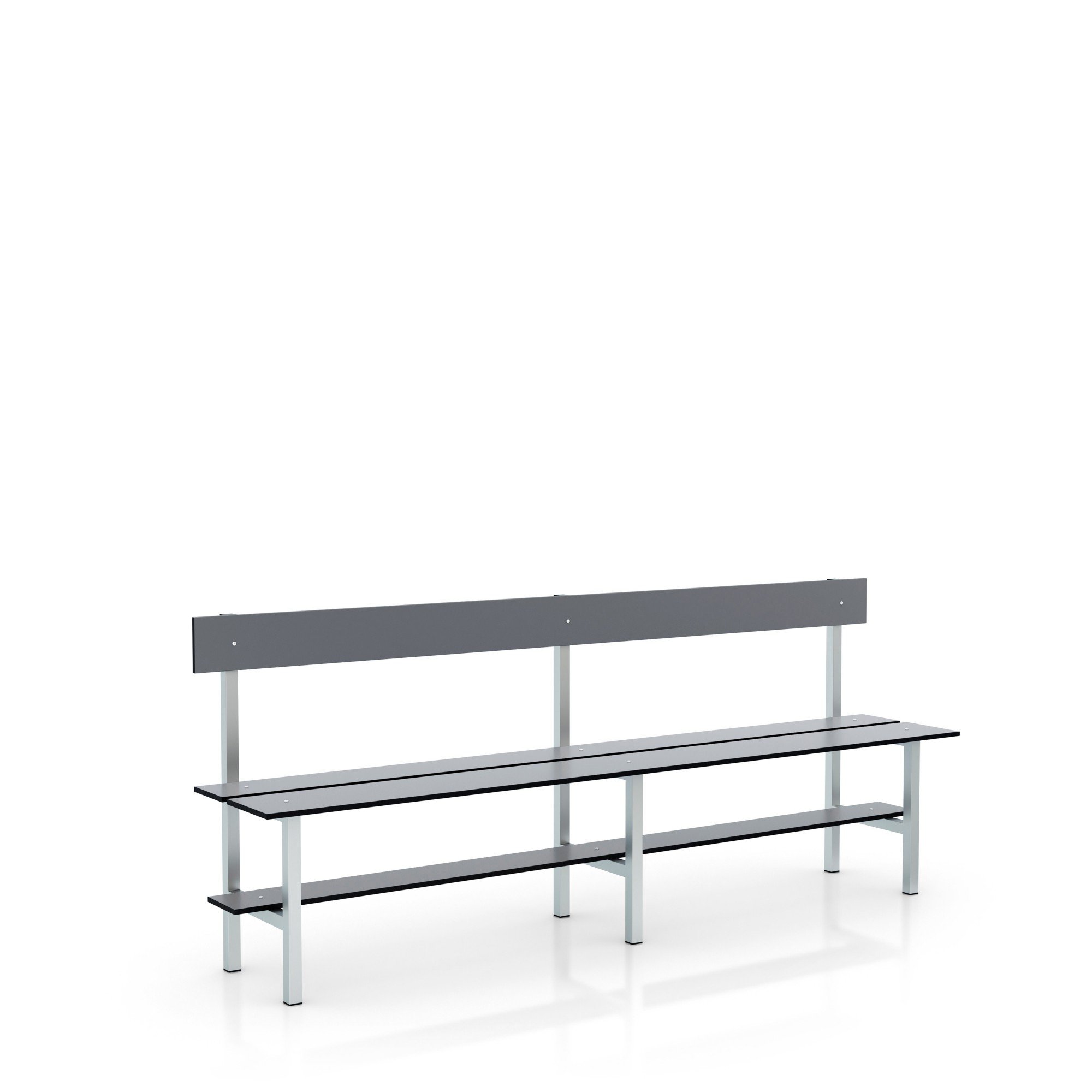 | Características | Banco de vestuario con respaldo, fabricado con dos estructuras de acero inoxidable y paneles fenólicos especiales para zonas con alta humedad. |