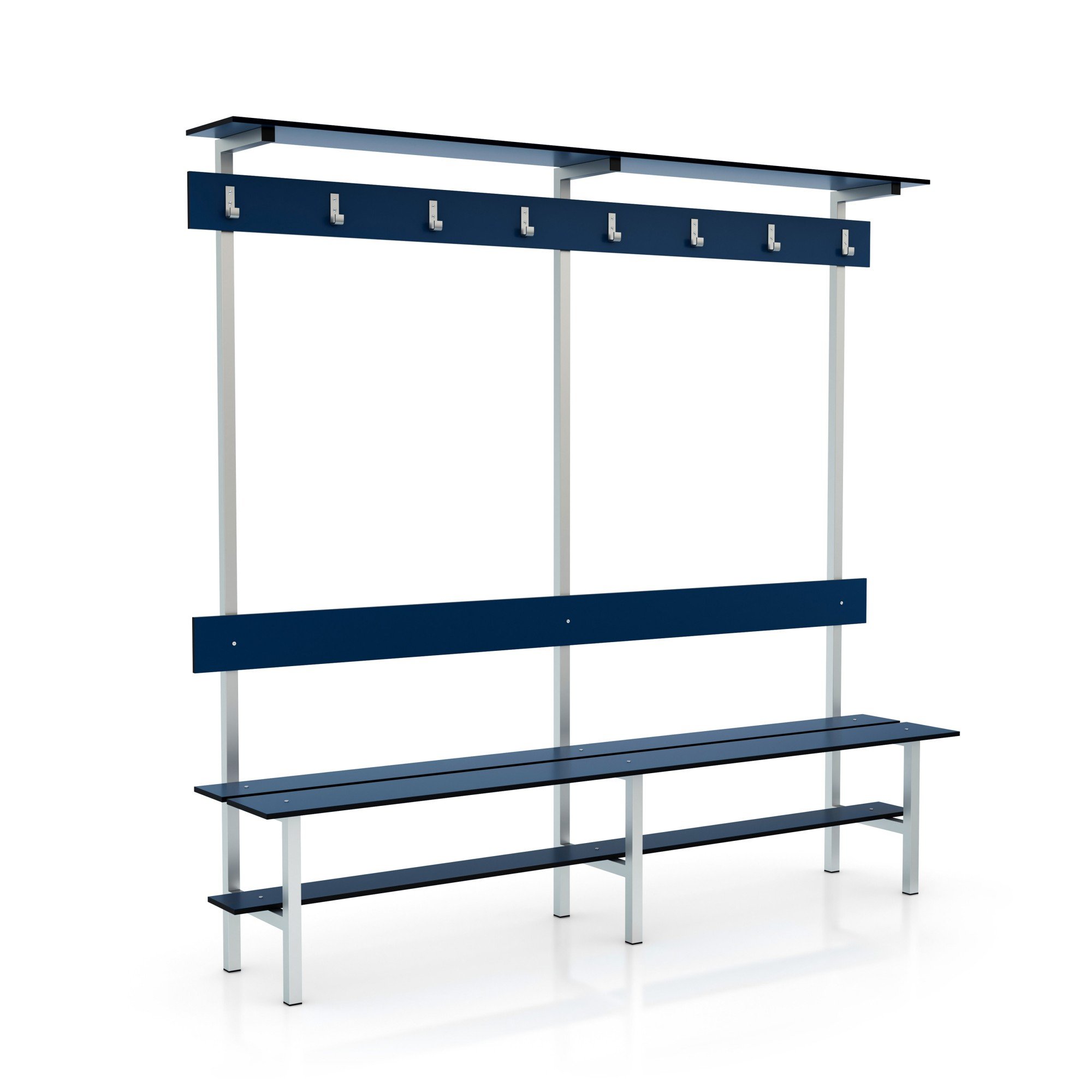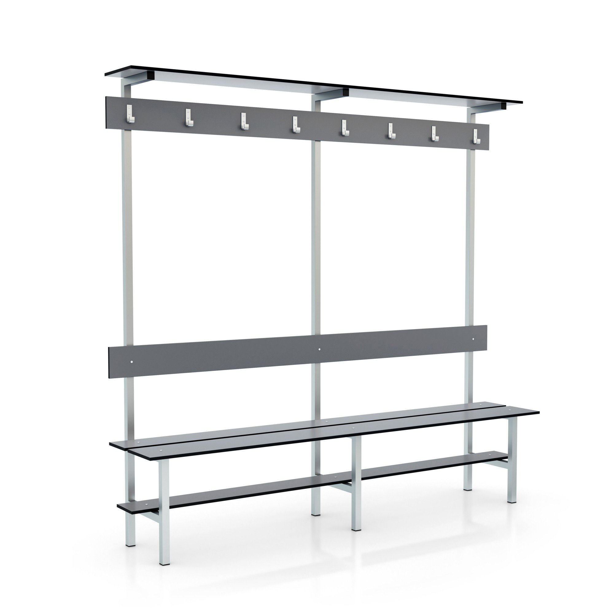 | Características | Banco de vestuario con respaldo, percha y repisa, fabricado con dos estructuras de acero inoxidable y paneles fenólicos especiales para zonas con alta humedad. |