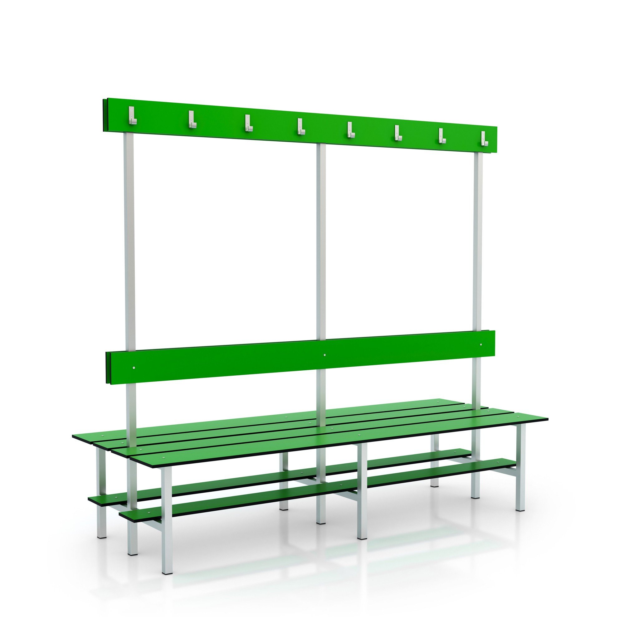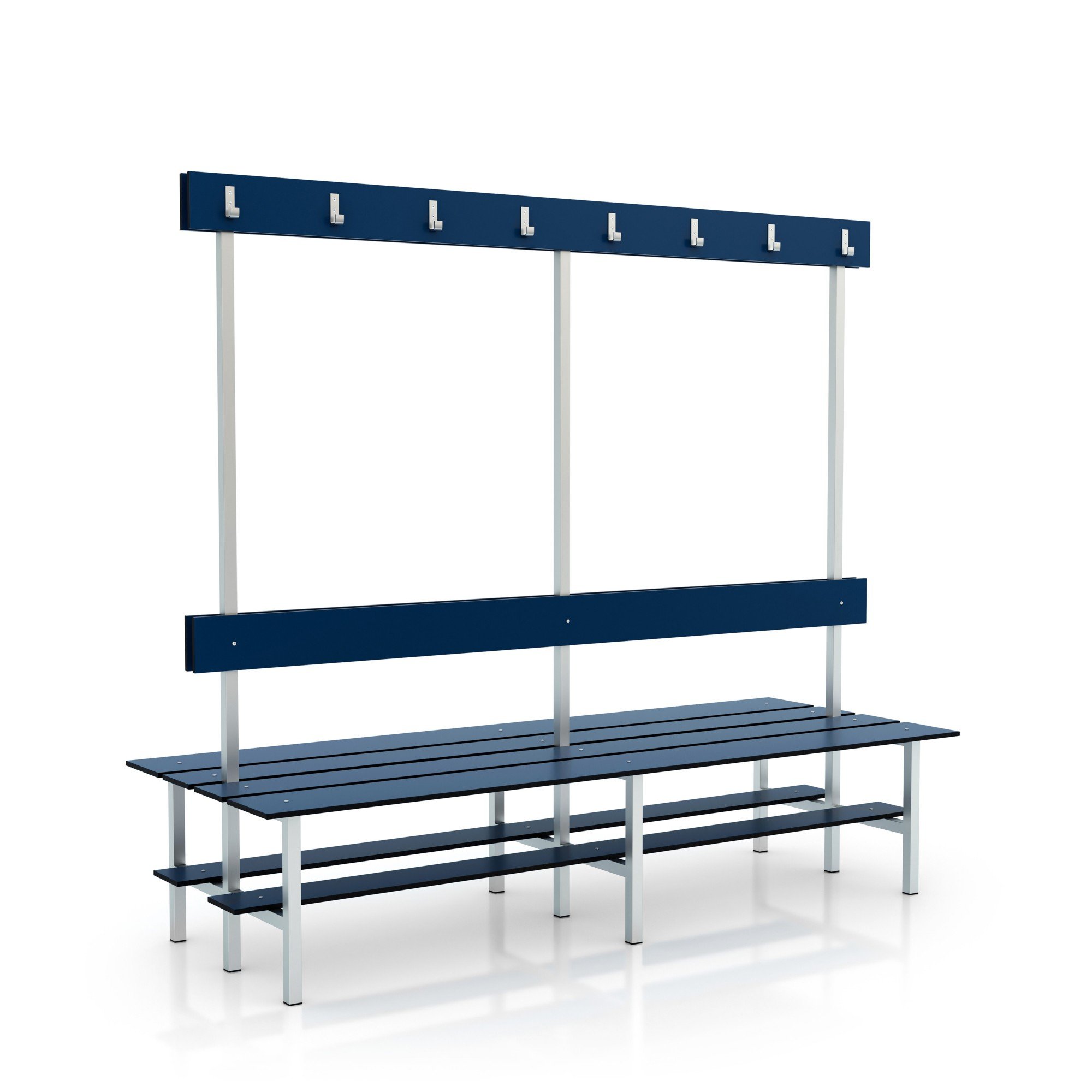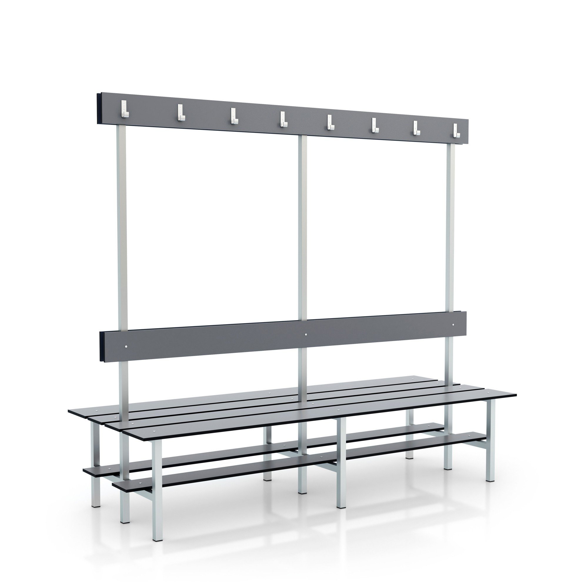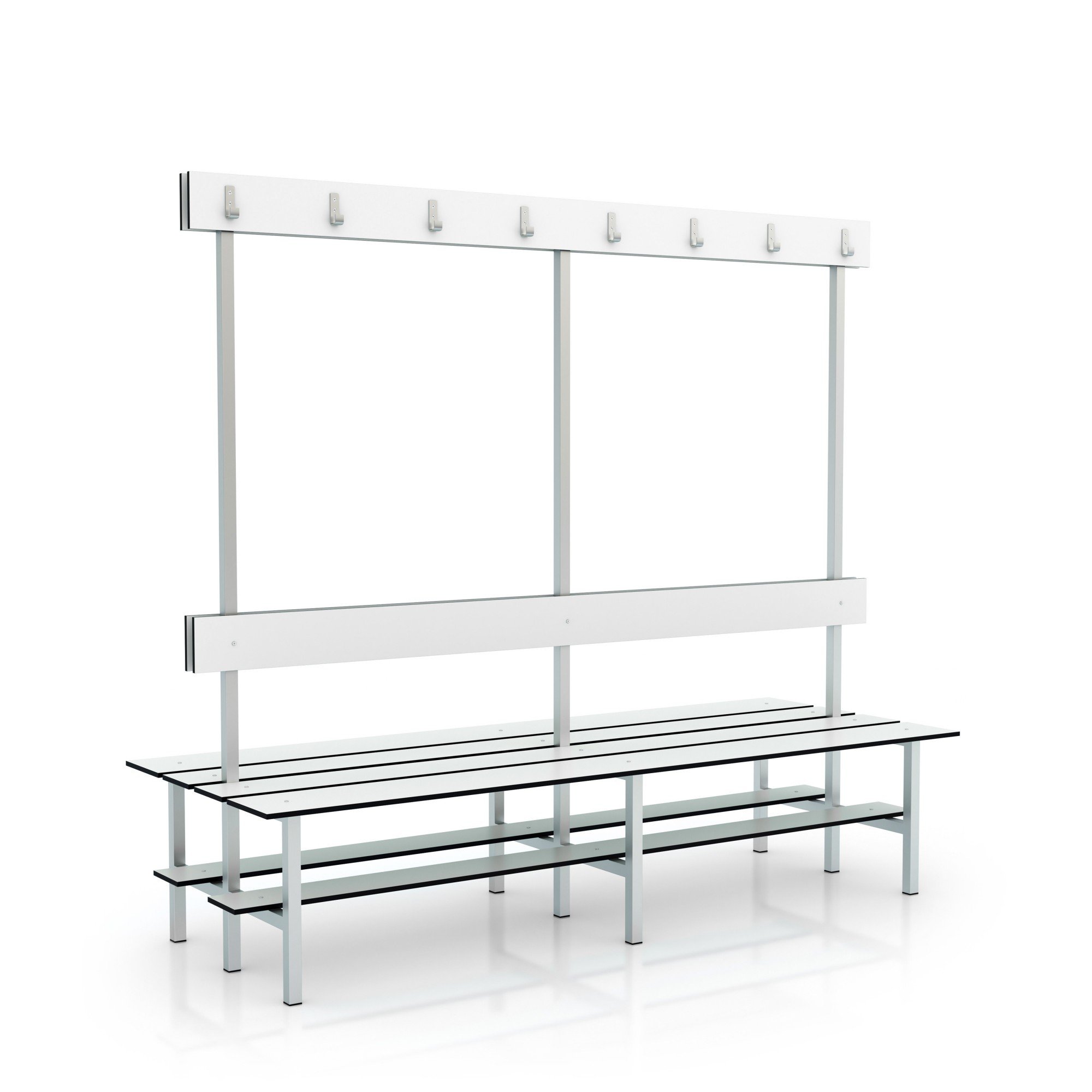 | Características | Banco de vestuario con respaldo y percha, fabricado con dos estructuras de acero inoxidable y paneles fenólicos especiales para zonas con alta humedad. |